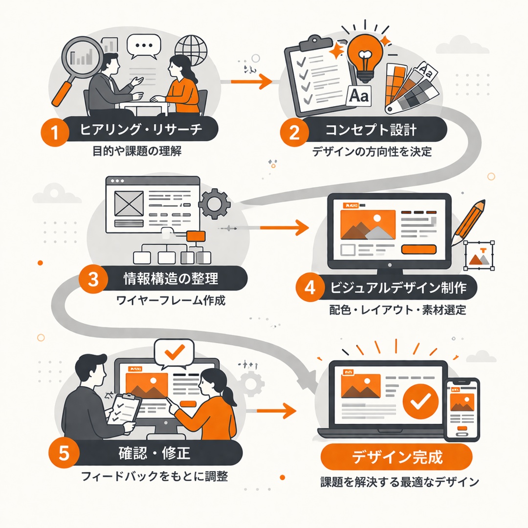 このように、デザインが完成するまでにはいくつものプロセスがあり、それぞれの工程には明確な役割があります。ヒアリングやリサーチによって課題を理解し、コンセプトを設計し、情報構造を整理しながらビジュアルを作り上げていく。この一連の流れがあるからこそ、単なる見た目ではなく、意味のあるデザインが生まれます。デザイン制作は決して偶然に完成するものではなく、思考と設計の積み重ねによって形作られていくものです。